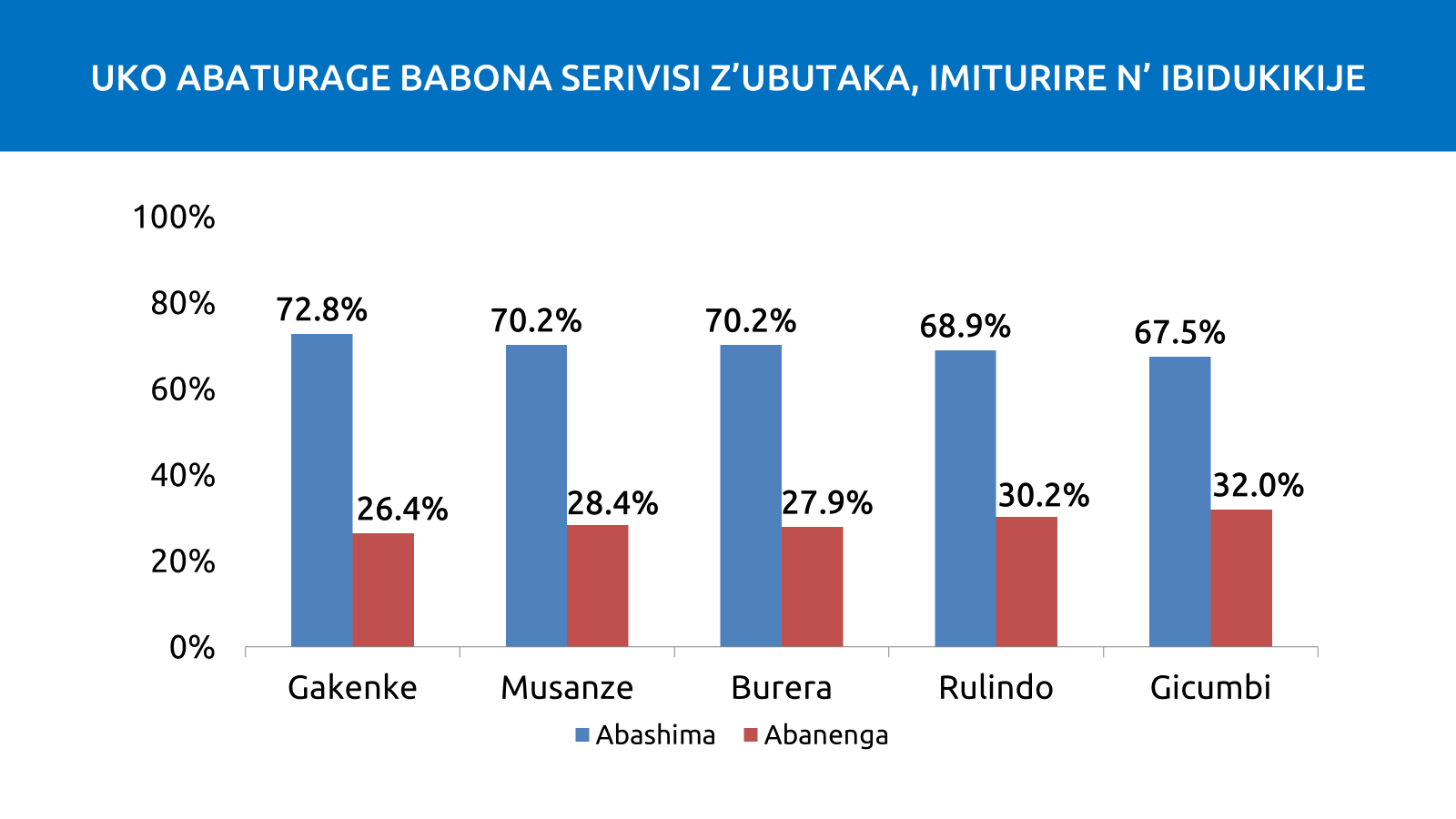 Imibare yerekana ko 72.8% by’abaturage ba Gakenke banyuzwe n’izi serivisi, bikurikirwa na Musanze na Burera binganya 70.2%. Rulindo ifite 68.9%, naho Gicumbi ikagira 67.5%, bigaragaza ko nubwo hari intambwe itewe, hakiri ibyo gutunganya mu turere tumwe na tumwe kugira ngo serivisi zirusheho kuba nziza.