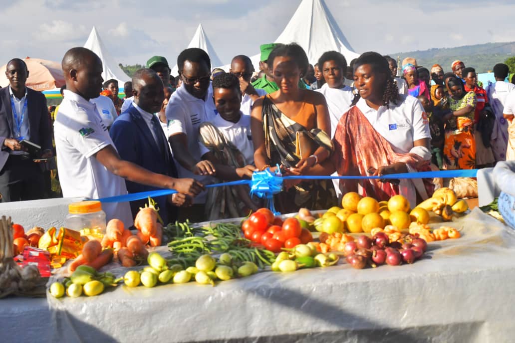 Umuyobozi w’Akarere wungirije Uwera Parfaite ari kumwe n’abayobozi ba Duhamic Adri bubatse isoko ry’imboga n’imbuto